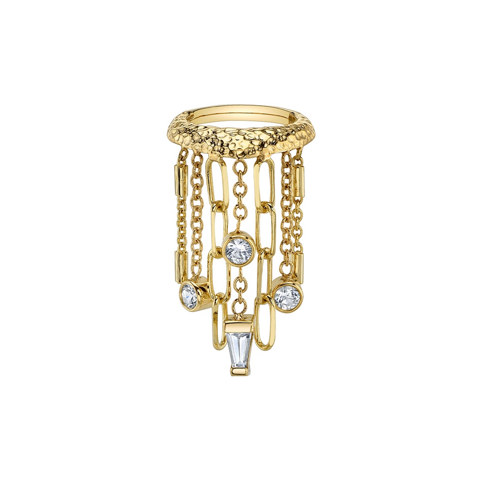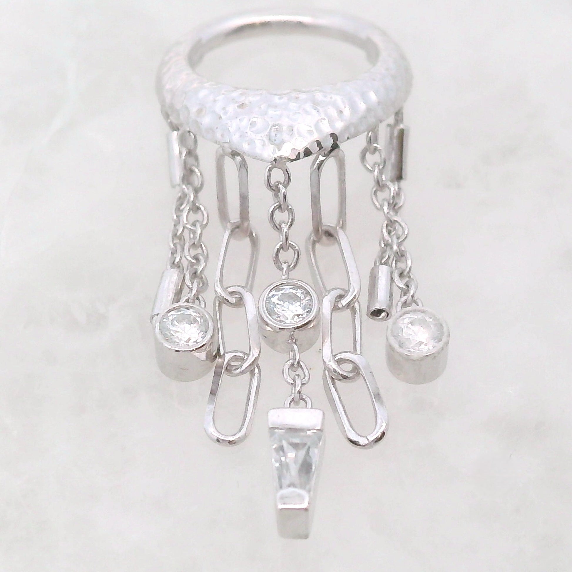Graduating Multi Chain Fringe Attached Along Bottom Edge of Ring - Chains From Outside to Center: 10mm Length of Ophelia Chain, 12mm Length of 1mm Cable Chain with 2mm Open Back Round Bezel Fixed to Bottom, 14mm Length of Capulet Chain, 16mm Length of 1mm Cable Chain with 2mm Open Back Round Bezel Fixed at 8mm and 3x2x1mm Tapered Baguette Bar Fixed to Bottom with Wide End Up