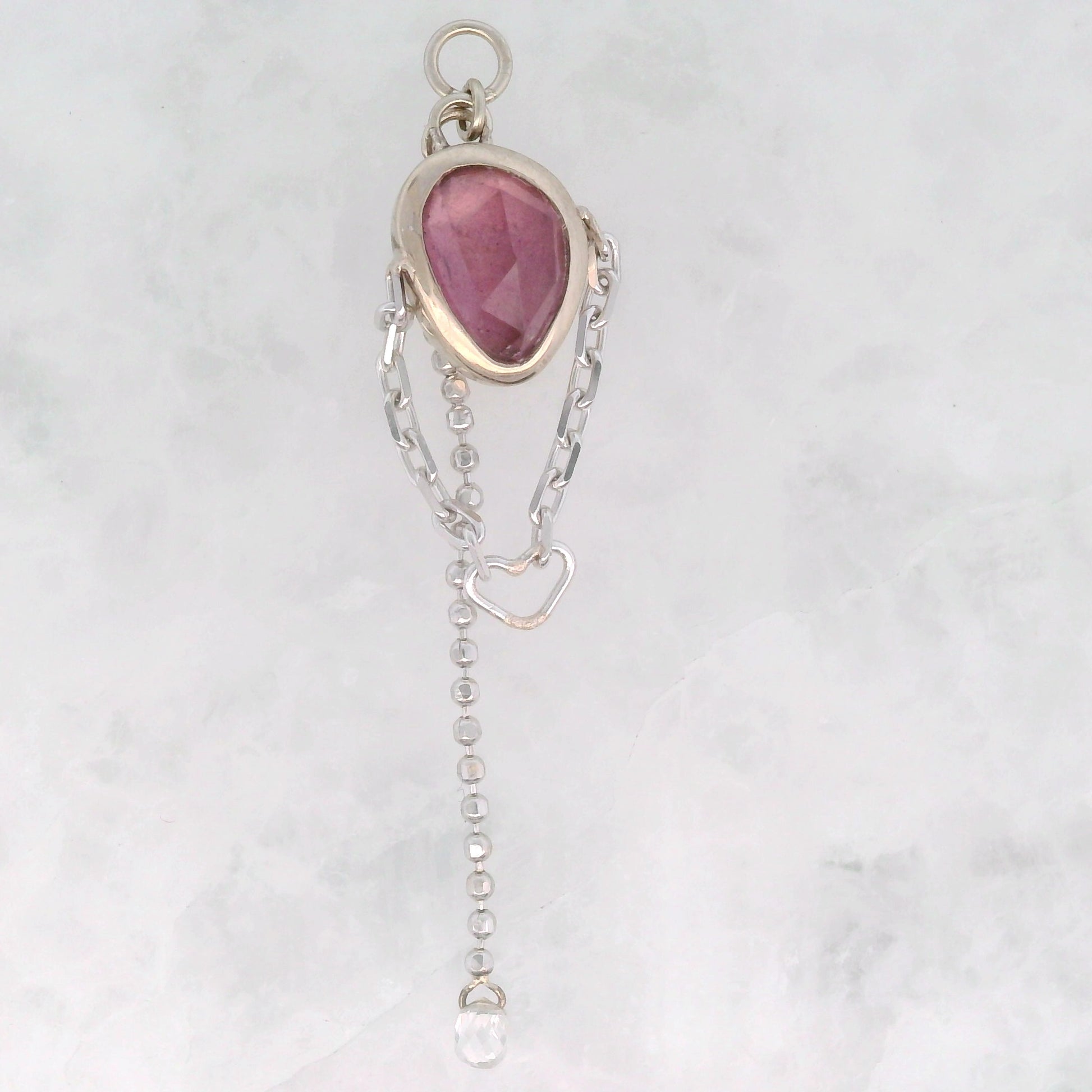 Pink Tourmaline Pear with White Diamond Briolette and Heart Dangle in White Gold